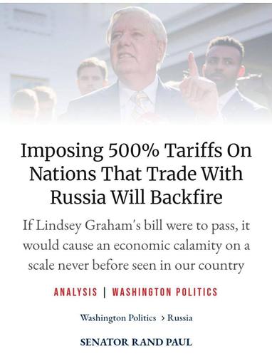 Введение 500%-ных пошлин на товары стран, торгующих с Россией, приведет к обратным результатам, считает республиканец Рэнд Пол.