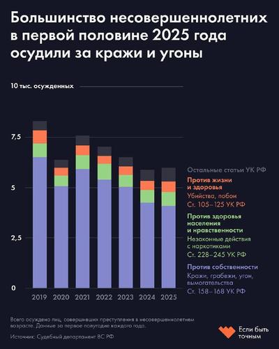 В первой половине 2025 года 4 тысячи подростков (68%) были осуждены за преступления против собственности (ст. 158–168 УК): прежде всего кражи, включая квалифицированные, а также угон транспорта, грабежи, мошенничество и разбои. Однако доля таких преступлений постепенно уменьшается: в 2019 году они составляли около 80% всех приговоров подросткам.