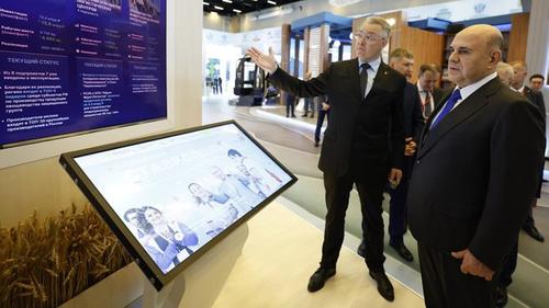 Премьер-министр РФ Михаил Мишустин (справа) на экспозиции Кавказского инвестиционного форума, фото: government.ru