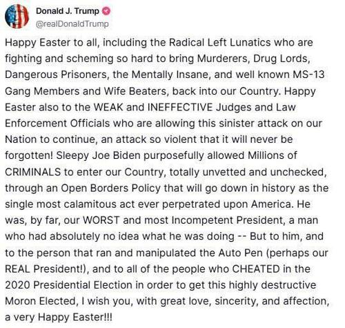 Счастливой Пасхи всем, включая радикальных левых безумцев, которые так упорно борются и строят козни, чтобы вернуть убийц, наркобаронов, опасных заключенных, психически больных и известных членов банды MS-13 и истязателей жен обратно в нашу страну.
