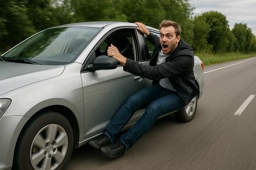 С едущей сзади машины на видеорегистратор сняли как на открытой двери такси висит мужчина, а автомобиль при этом продолжает двигаться. Съемка попала в интернет. Там ее отмониторили гаишники и нашли водителя-нарушителя, который рассказал, что подъехал на вызов; вышла женщина; едва она села, подбежал мужчина; женщина закричала, что ее преследуют; водитель тронулся, а мужчина уцепился за дверь и какое-то время, пока мог, держался за нее на ходу.