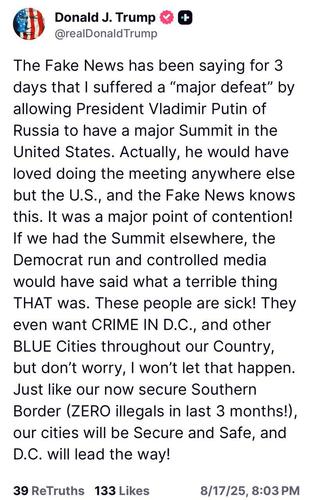 Если бы саммит прошёл в другом месте, контролируемые демократами СМИ сказали бы, как ужасно это было. Эти люди больны! Они даже хотят происшествий в Вашингтоне и других городах по всей нашей стране, но не волнуйтесь — я не позволю этому случиться.