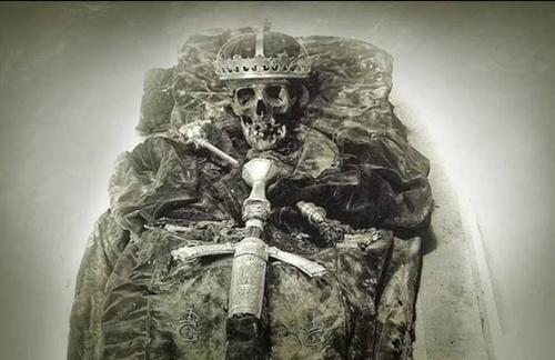 На фотографии — скелет монарха, покоящийся в роскошных, но истлевших одеяниях. Рядом лежат корона, скипетр и меч — символы власти, которые когда-то воплощали силу и величие короля, а теперь лишь подчеркивают хрупкость человеческого существования.