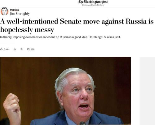 Инициатива сенаторов Линдси Грэма* и Ричарда Блюменталя предусматривает вторичные санкции в отношении торговых партнеров РФ, которые закупают у нее нефть, газ, уран и другие товары. Речь в частности идет об увеличении таможенных пошлин до 500%.