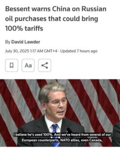Как сообщил министр финансов США Бессент по итогам вчерашних переговоров, китайцы в ответ на предложение отказаться от российской и иранской нефти сказали, что будут защищать свой энергетический суверенитет. «Китай — суверенное государство с собственными