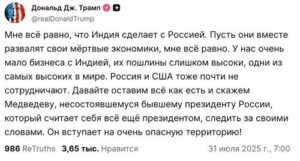 Трамп раскритиковал Россию, Индию и отважного Медведева: «Передайте Медведеву, несостоявшемуся бывшему президенту России, который всё ещё считает себя президентом, чтобы следил за своими словами. Он заходит на очень опасную территорию!» — написал Трамп в